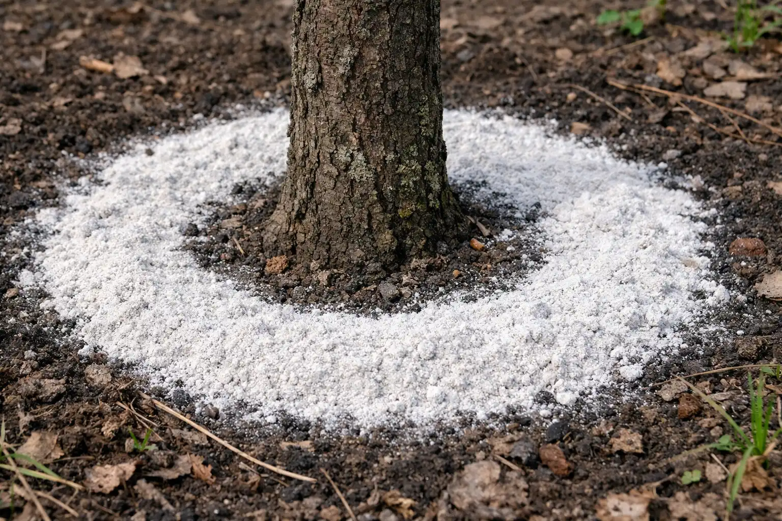 Zapracovanie do studní. Účinnejšia metóda. Okolo stromu vo vzdialenosti 0,5 – 1 m od kmeňa urobte niekoľko malých jamiek (15 – 20 cm hlbokých), nasypte do nich múku a zasypte zeminou.