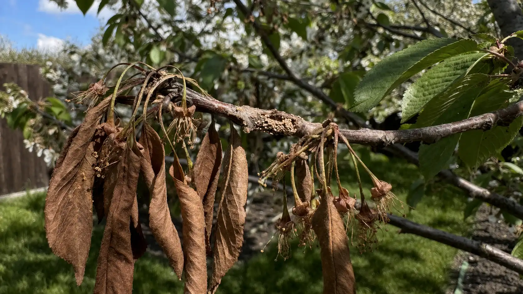 Príčinou katastrofy je vysoká vlhkosť počas kvitnutia. Na piestik sa dostane spóra huby, ktorá vyklíči vo vnútri dreva a upchá cievy, čím pripraví konár o výživu.