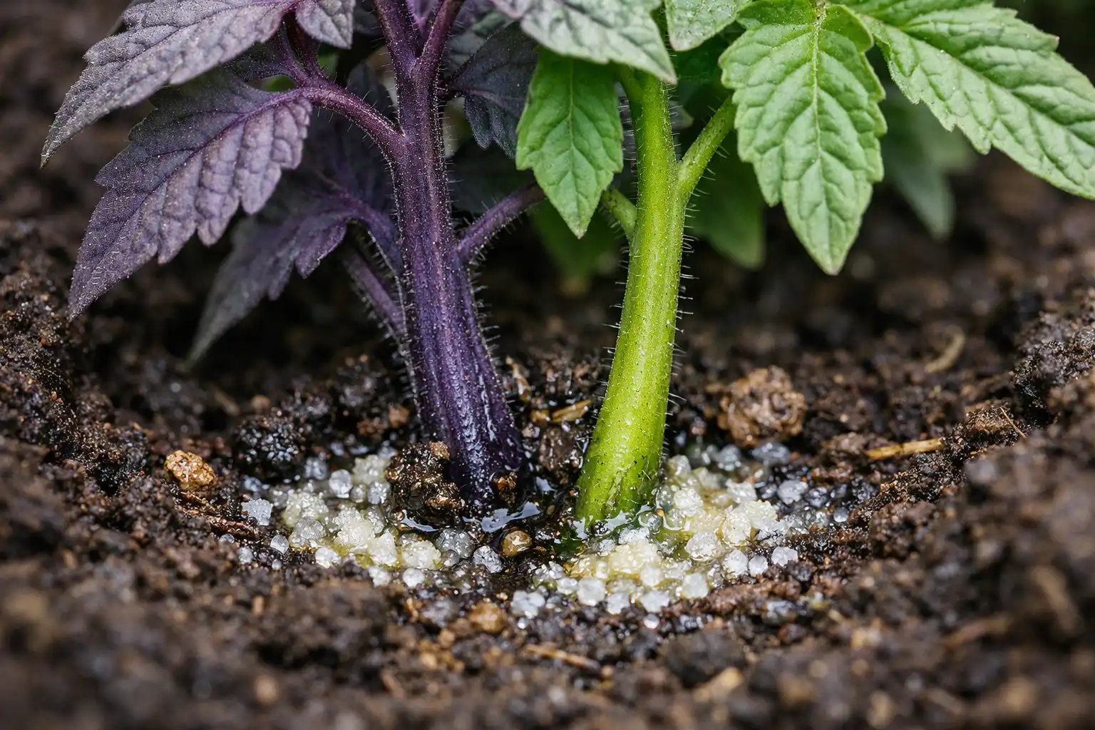 Keď teplota pôdy klesne pod 14°CKoreňový systém paradajok prakticky prestáva asimilovať fosfor. Aj keď je tohto prvku v pôde dostatok, v chladnej pôde sa mení na formu, ktorá je pre rastlinu nedostupná. V dôsledku toho sa v tkanivách hromadia antokyány – pigmenty, ktoré dodávajú veľmi modrofialové sfarbenie. Ide o obrannú reakciu na chladový a svetelný stres.
