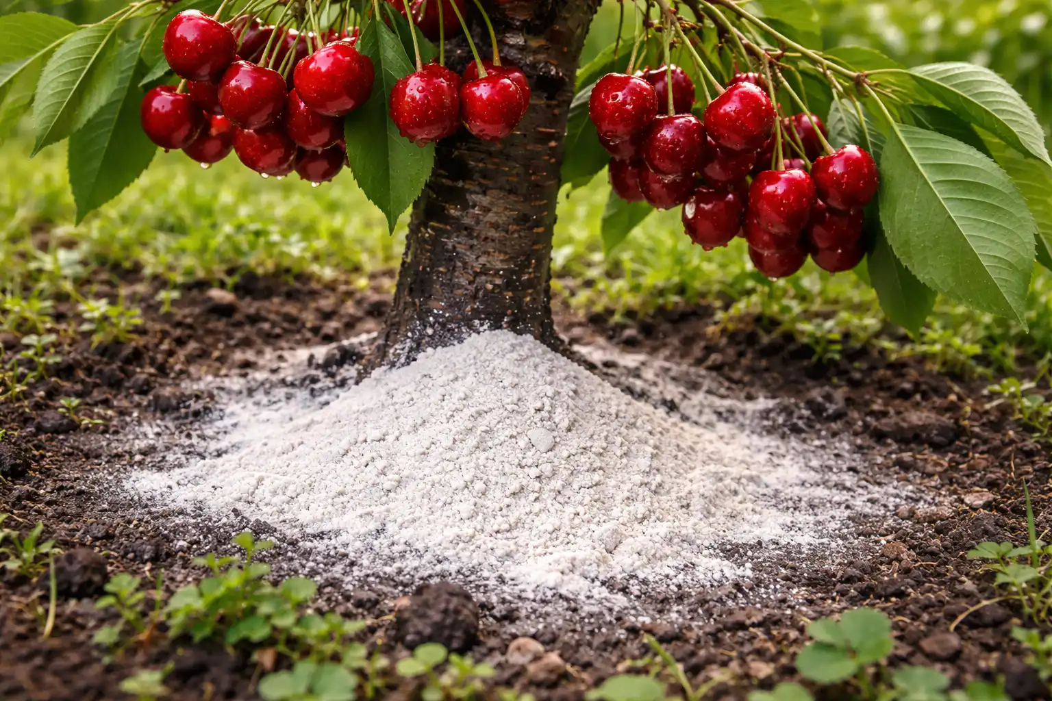 Čerešne sú plodinou, ktorá neznáša kyslé prostredie. Ak je pH pôdy nižšie ako 6,0, korene jednoducho nedokážu absorbovať dusík a draslík, bez ohľadu na to, koľko ich použijete. Dolomitová múka pôsobí šetrnejšie ako vápno, nespáli mladé sacie korene a začína pôsobiť práve v čase aktívneho pohybu miazgy.