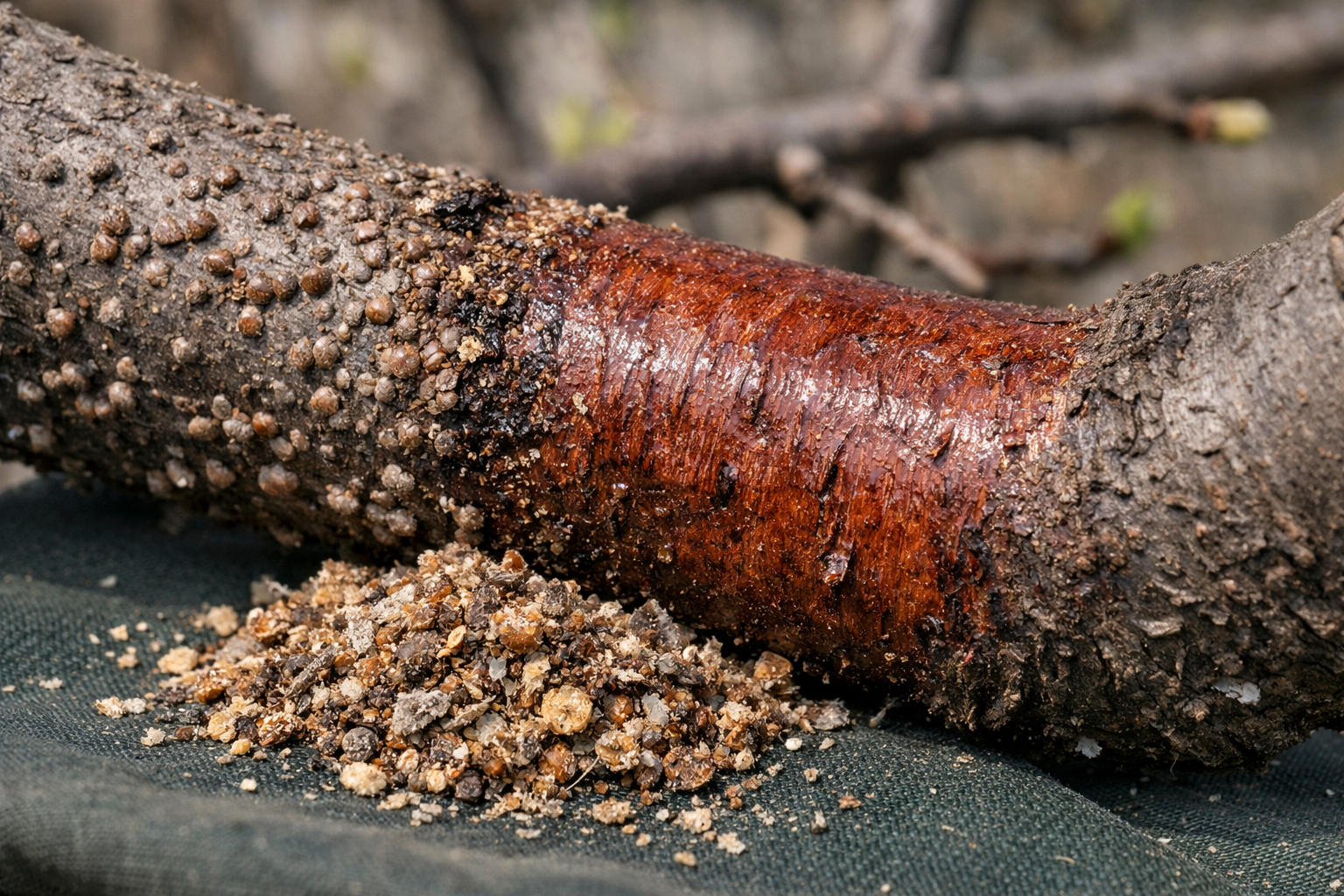 Schránka je suchá, ľahko sa oddeľuje od kôry nechtom a pod ňou sa nenachádza žiadne živé tkanivo ani mokrá stopa.