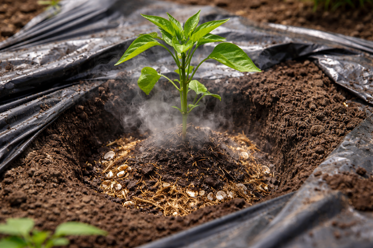Na rýchle zahriatie lôžka používam metódu „horúcej diery“ a čiernu mulčovaciu fóliu. To vám umožní vysadiť sadenice o 10 dní skôr ako zvyčajne.