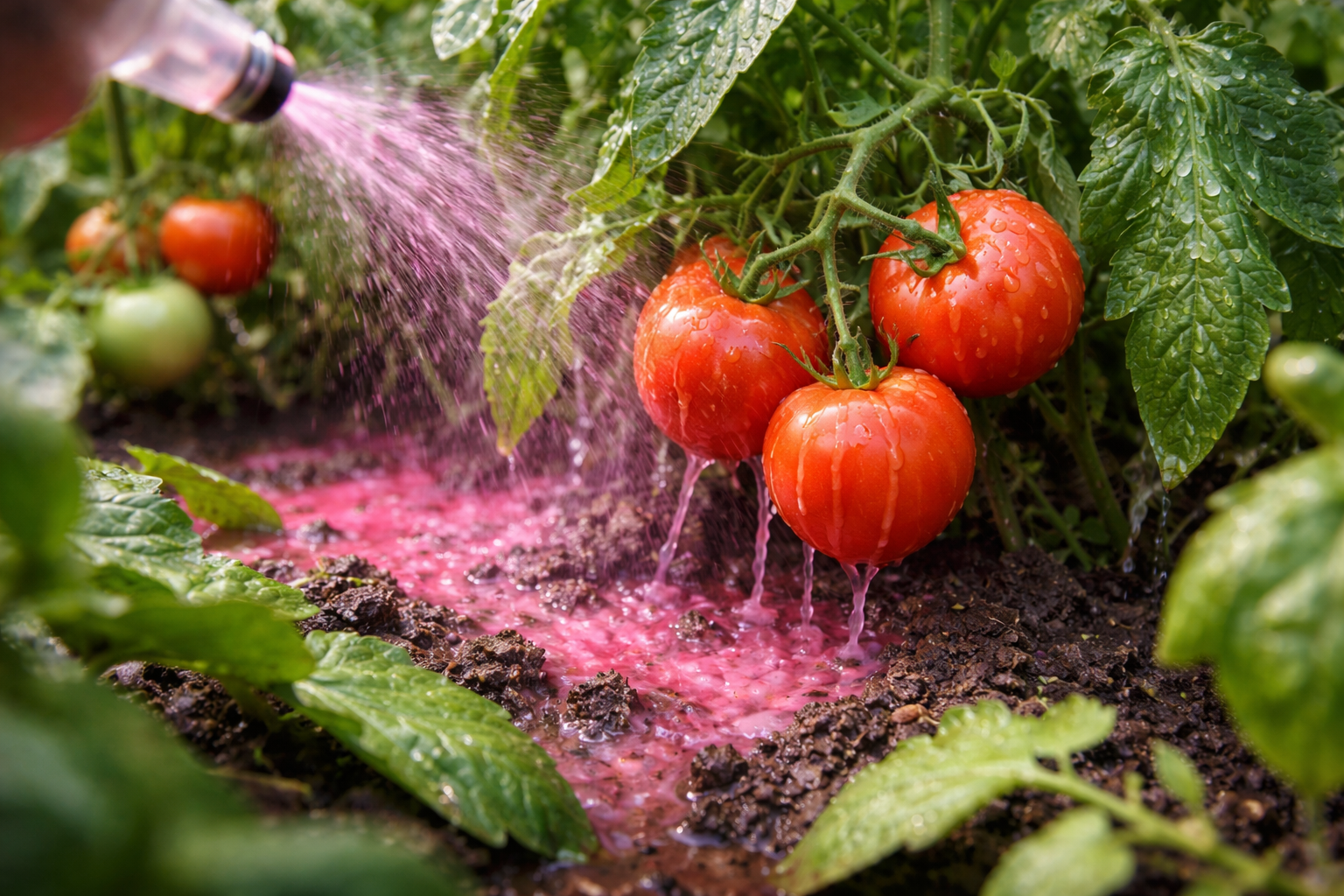 Slabá bledoružová tekutina dokonale dezinfikuje pôdu pred výsadbou mladých sadeníc na záhon.