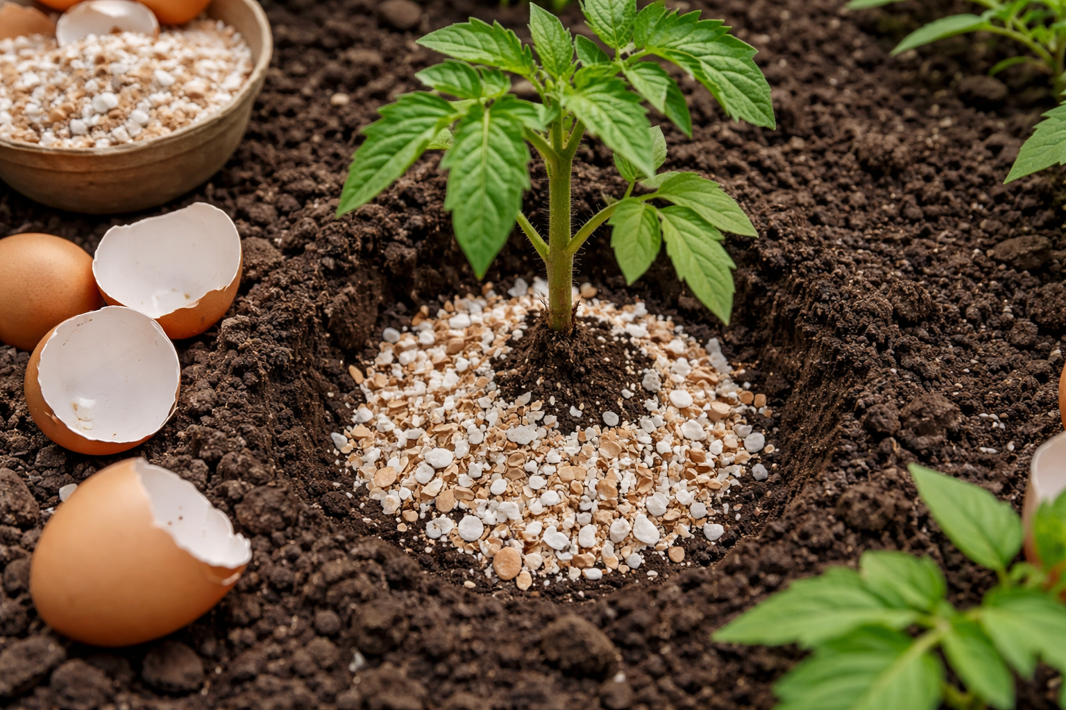 Keď sú paradajky vysadené v skleníku alebo v otvorenom teréne, rastliny sú vystavené extrémnemu stresu. Vtedy kriticky potrebujú vápnik na vybudovanie silného koreňový systém a silným stonkom. Nedostatok tohto prvku nevyhnutne vedie k výskytu na spodných plodoch apikálna hniloba – tmavé, suché škvrny, ktoré ničia úrodu. Obyčajné škrupiny zo slepačích vajec sa skladajú takmer z deväťdesiatich percent z tohto minerálu, čo z nich robí ideálne riešenie tohto problému.