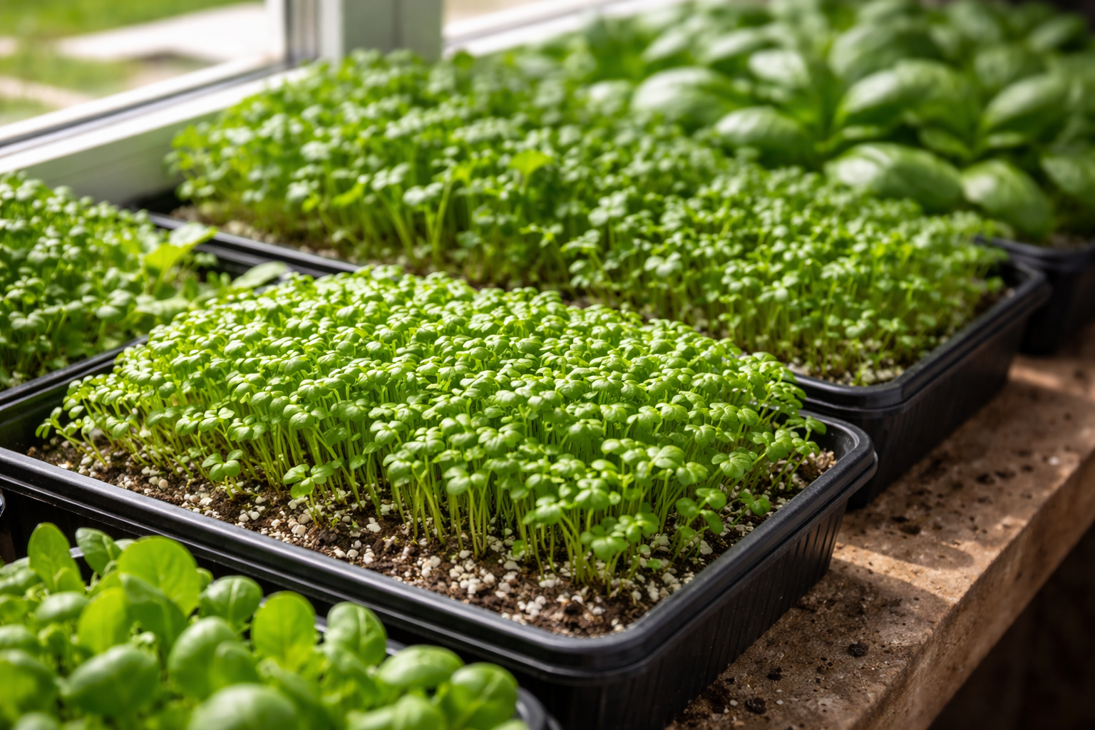 Tajomstvo rýchleho začiatku spočíva v správnom výbere semien. Neberte si hneď rozmarné rastliny, lepšie je dať prednosť plodinám, ktoré začiatočníkom odpúšťajú chyby. Vynikajúce sa ukážu Řeřicha, listová horčica и rukola. Majú vysokú klíčivosť a už v počiatočnom štádiu vytvárajú hustú čiapočku.