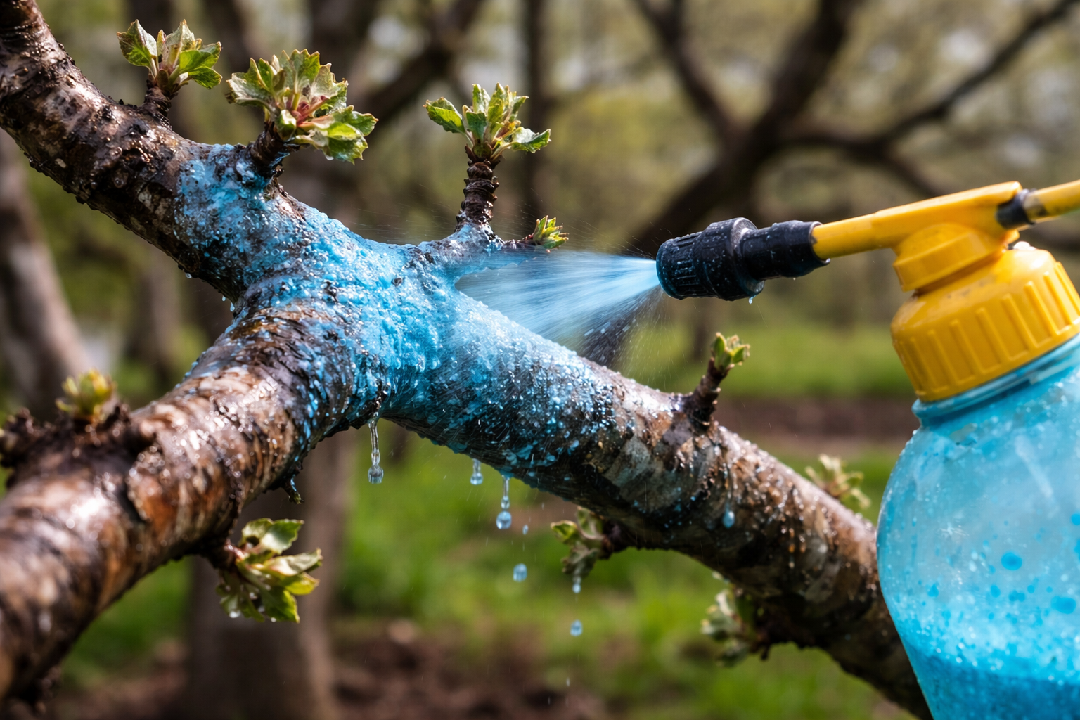 Dôkladne postriekajte kmeň a kostrové konáre, až kým modrasté kvapky ľahko nesteká.